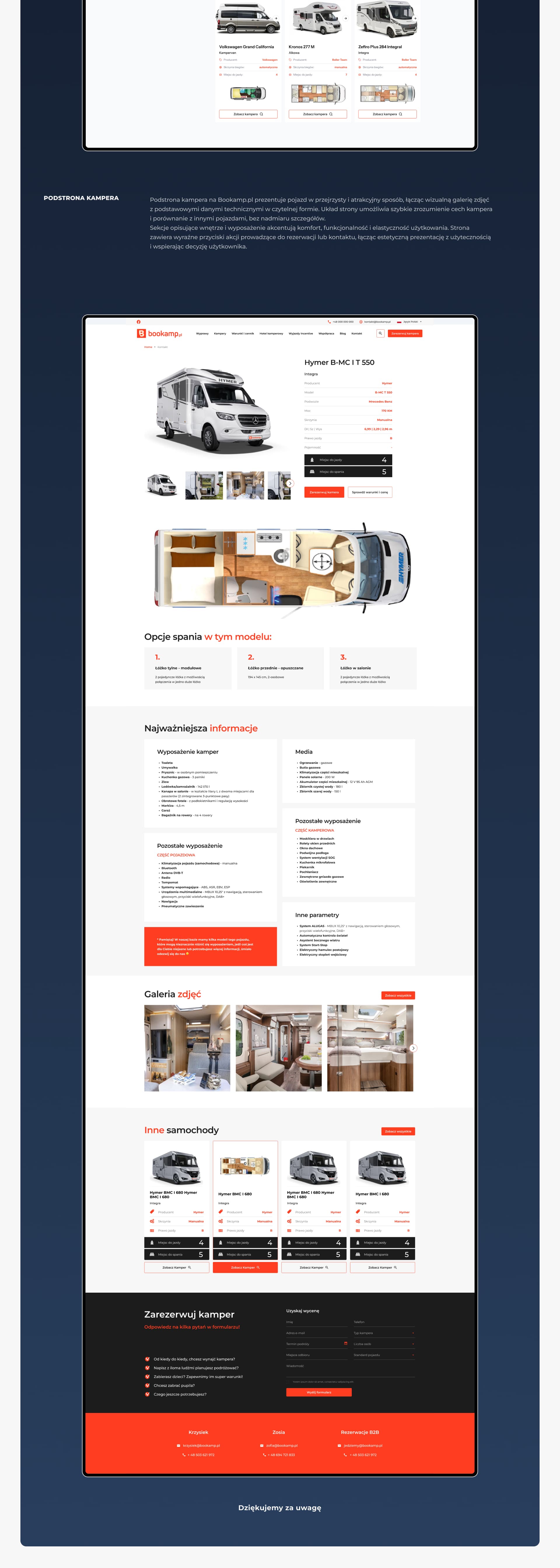 Najważniejszym elementem projektu jest podstrona kampera, która działa jak centralny punkt procesu wynajmu. Połączyliśmy czytelną prezentację danych technicznych i parametrów z mocną warstwą wizualną: galerią, układem wnętrza, opcjami spania oraz sekcjami wyposażenia podanymi w łatwych do skanowania blokach. Całość domyka wyraźne CTA i ścieżka do rezerwacji lub kontaktu, uzupełniona o elementy utrzymujące użytkownika w serwisie (podobne pojazdy, opinie, szybkie wejścia do kolejnych kroków). Dzięki temu platforma nie tylko prezentuje ofertę, ale realnie wspiera decyzję i skraca drogę do wynajmu.