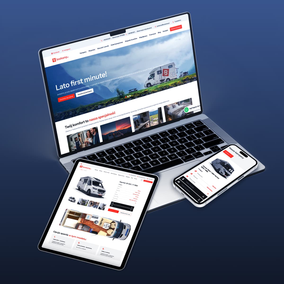 Celem tej realizacji było zaprojektowanie identyfikacji wizualnej oraz UX/UI platformy Bookamp.pl, która prezentuje ofertę wynajmu kamperów w sposób prosty, atrakcyjny i nastawiony na konwersję. Skupiliśmy się na tym, aby użytkownik mógł szybko przejść od inspiracji do konkretu: wybrać pojazd, porównać warianty i bez frustracji wykonać rezerwację lub wysłać zapytanie. Projekt został oparty o czytelną, modułową strukturę oraz system komponentów, które porządkują dużą liczbę informacji i pozwalają skalować serwis wraz z rozwojem floty i oferty.