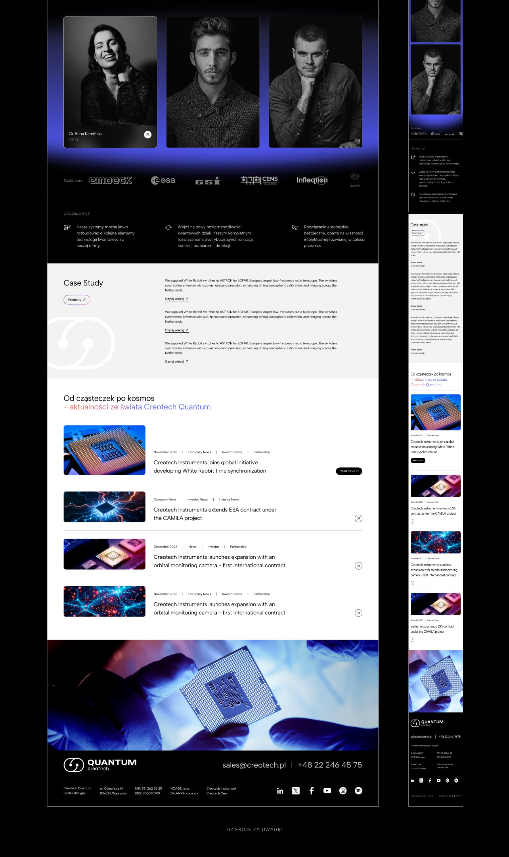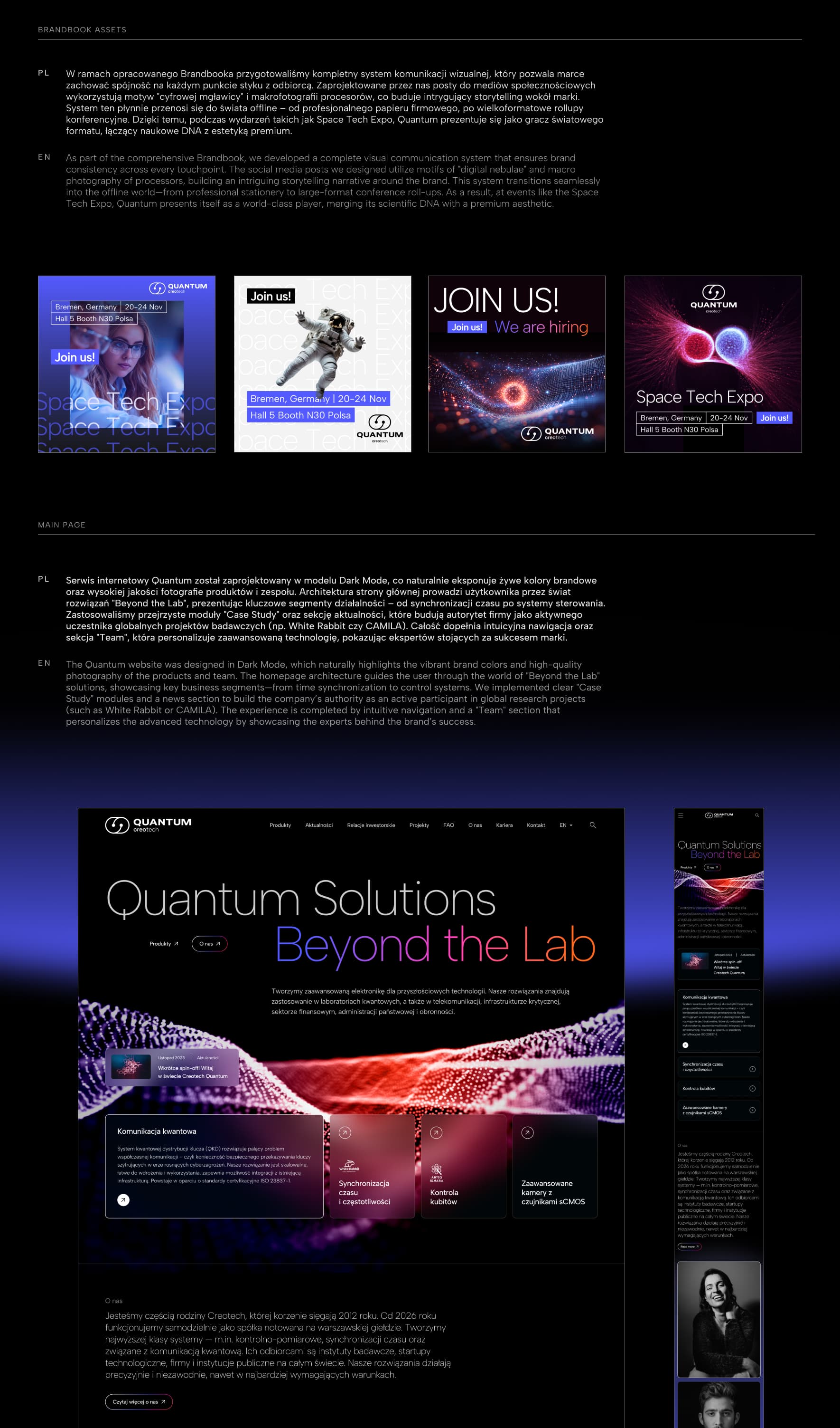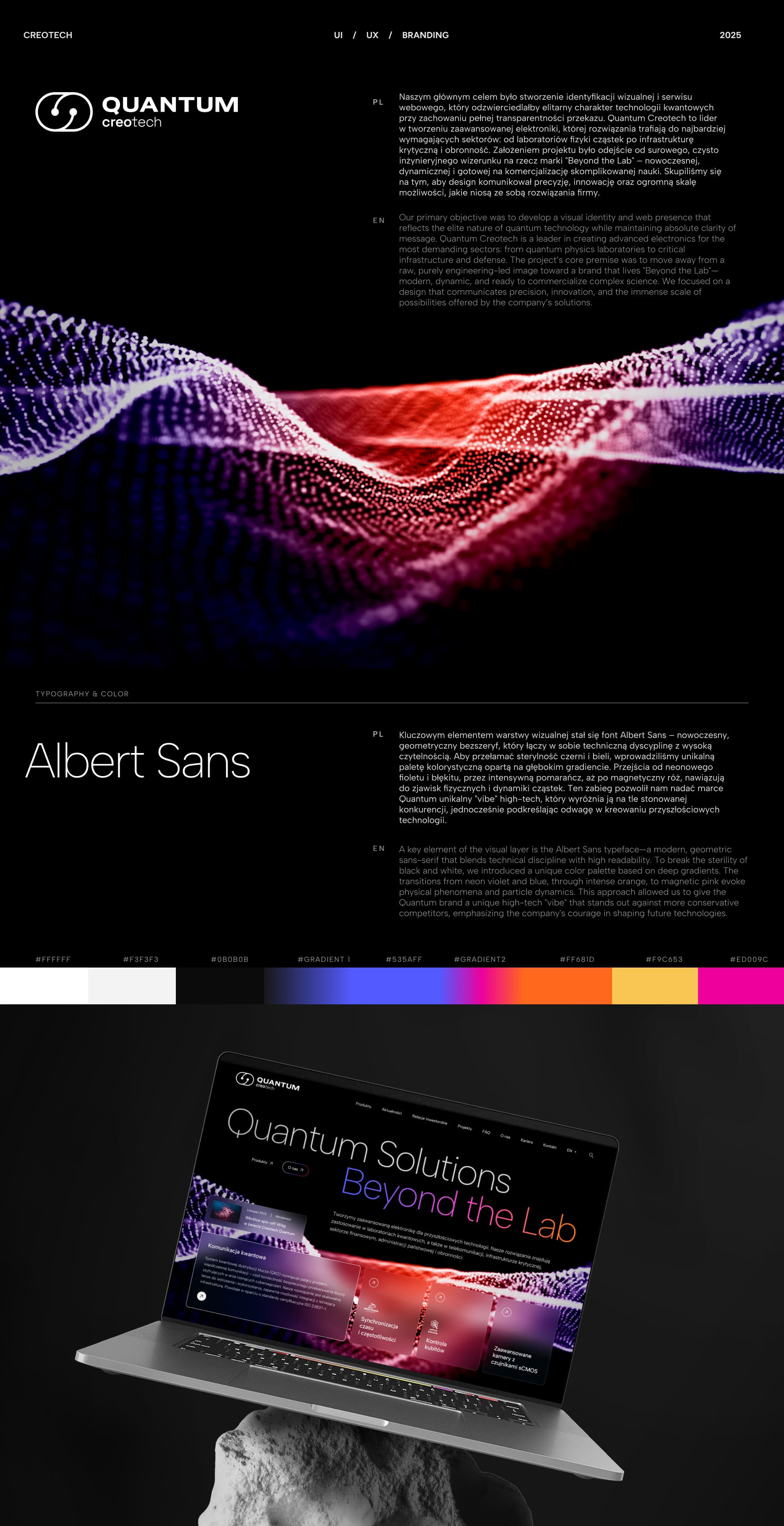 Naszym głównym celem było stworzenie identyfikacji wizualnej i serwisu webowego, który odzwierciedlałby elitarny charakter technologii kwantowych przy zachowaniu pełnej transparentności przekazu. Quantum Creotech to lider w tworzeniu zaawansowanej elektroniki, której rozwiązania trafiają do najbardziej wymagających sektorów: od laboratoriów fizyki cząstek po infrastrukturę krytyczną i obronność. Założeniem projektu było odejście od surowego, czysto inżynieryjnego wizerunku na rzecz marki "Beyond the Lab" – nowoczesnej, dynamicznej i gotowej na komercjalizację skomplikowanej nauki. Skupiliśmy się na tym, aby design komunikował precyzję, innowację oraz ogromną skalę możliwości, jakie niosą ze sobą rozwiązania firmy.