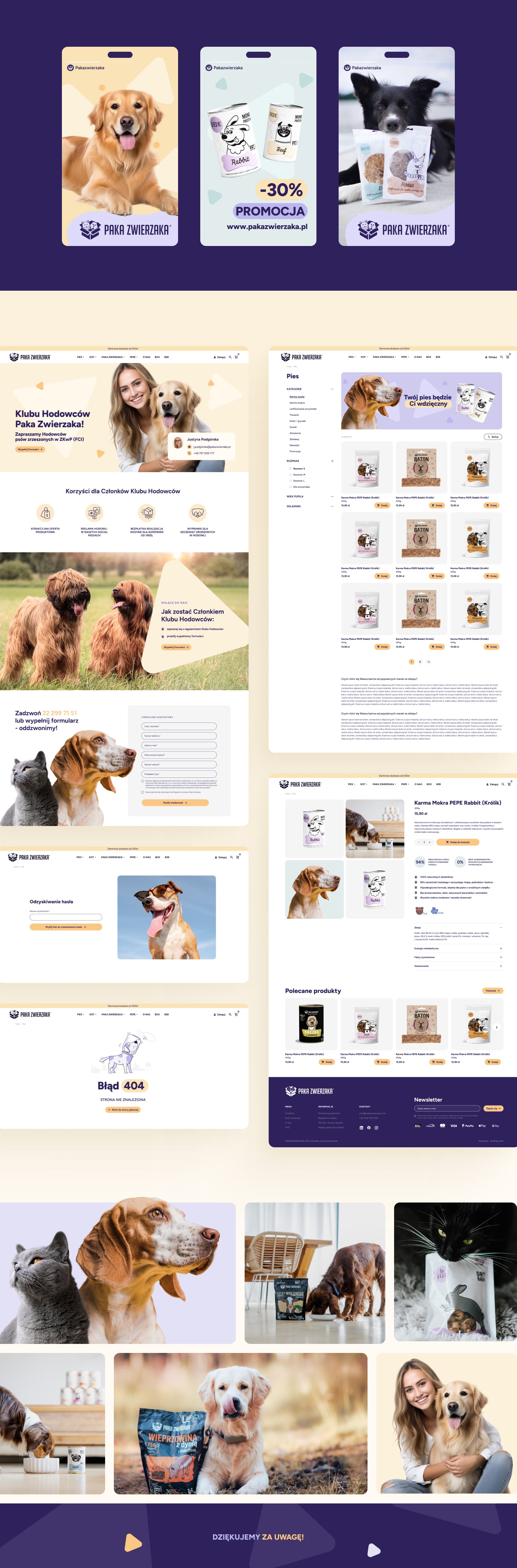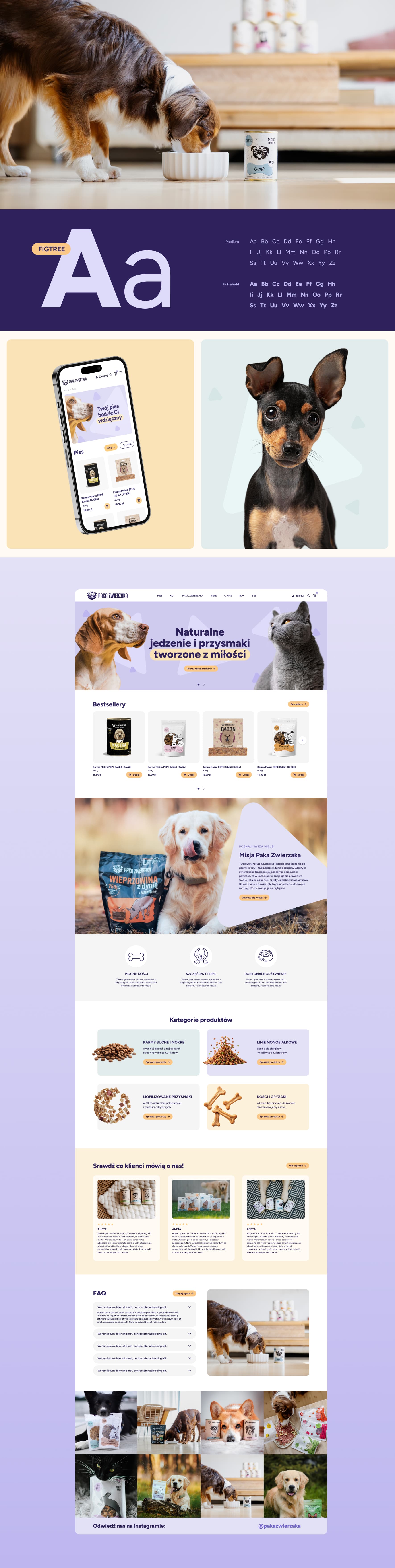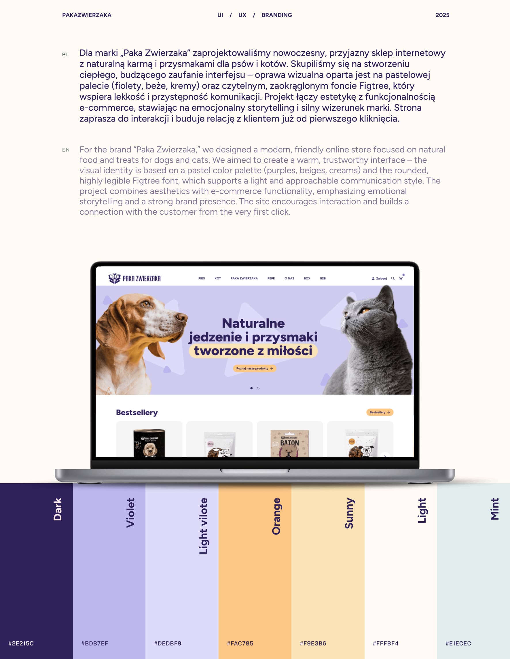Warstwa wizualna bazuje na pastelowej palecie barw (fiołki, beże, kremy), które budują atmosferę zaufania i bliskości. Zaokrąglony font wspiera lekkość przekazu, a emocjonalny storytelling wzmacnia relację marki z opiekunami zwierząt. Strona jest w pełni responsywna i zoptymalizowana pod kątem e-commerce, zapewniając intuicyjną nawigację i wygodne zakupy na każdym urządzeniu.