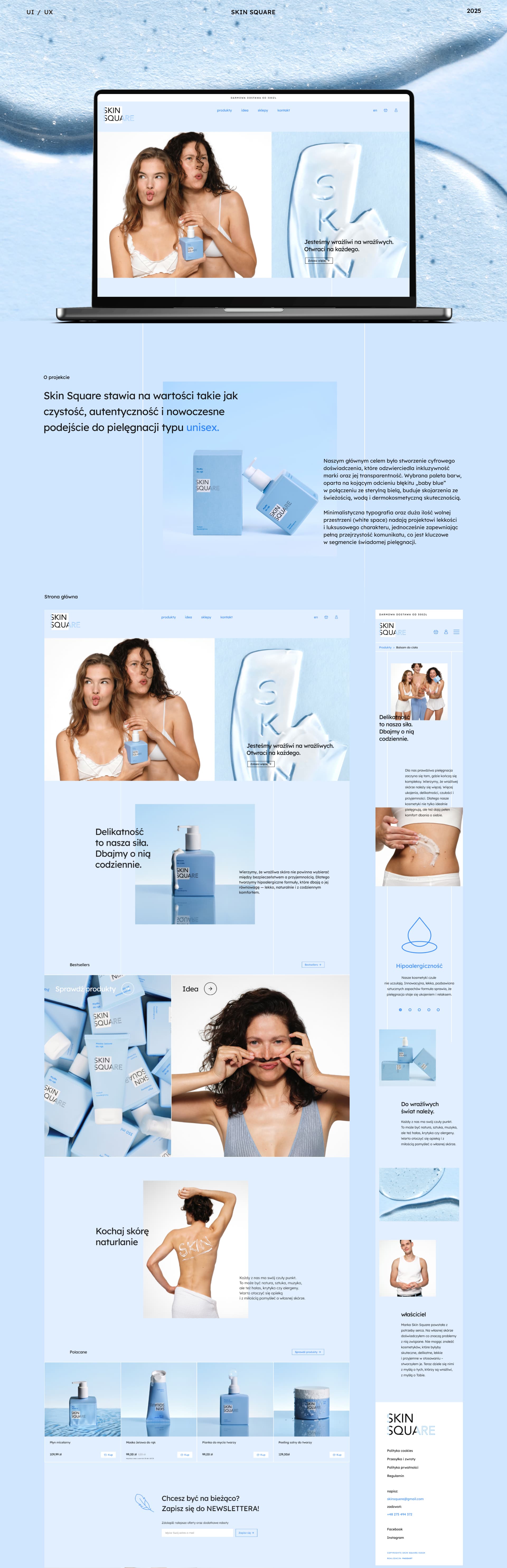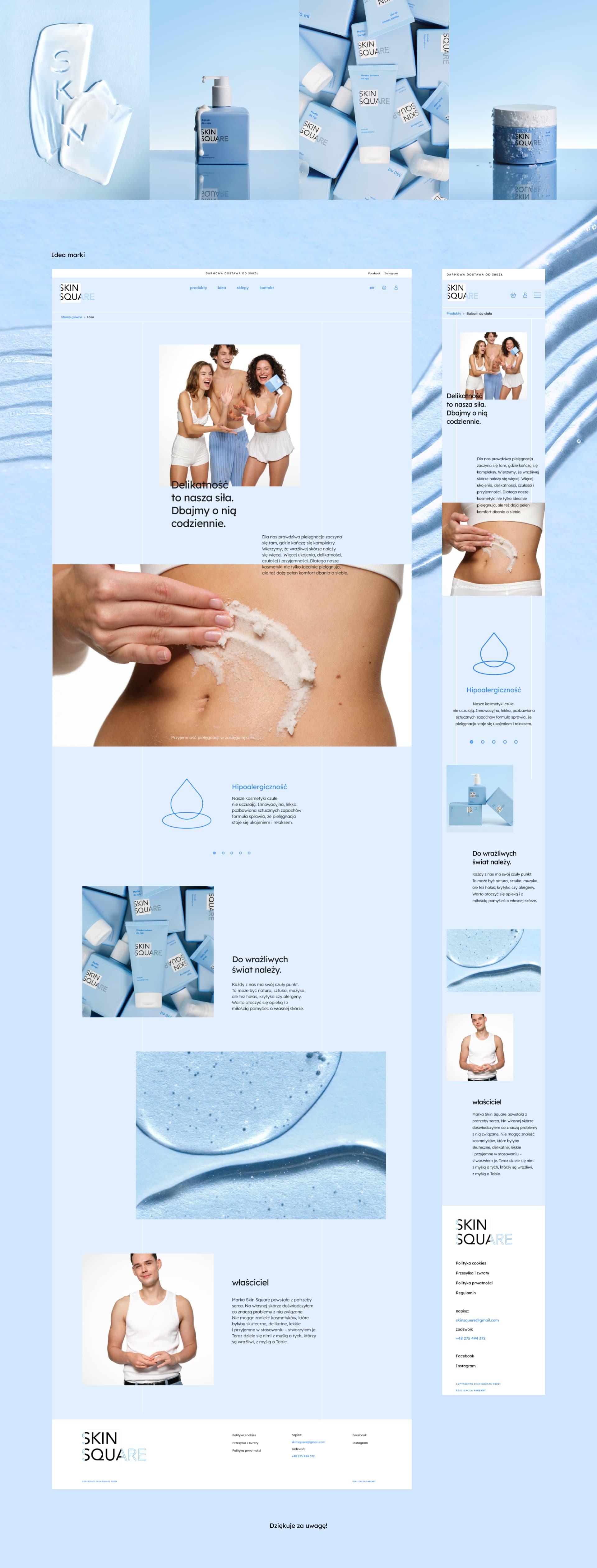 Dla Skin Square przygotowaliśmy elegancki sklep internetowy z kosmetykami, oparty na silniku PrestaShop. Projekt utrzymany jest w delikatnych odcieniach niebieskiego, co podkreśla świeżość i lekkość marki. Skupiliśmy się na przejrzystości układu, intuicyjnych filtrach i dopracowanej prezentacji produktów. Strona została zoptymalizowana pod kątem urządzeń mobilnych i wygodnego procesu zakupowego.